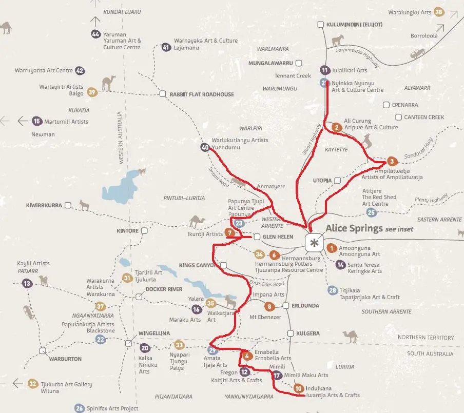 - Add 2 days for 4 more art centres ie Warlukurlangu Artists at Yunendumu, Ikuntji Artists at Haasts Bluff and Papunya Tjupi artists at Papunya, plus rthe Wirmbrandt Gallery at Tillmouth Well. Depart Alice Springs 9 am, visit Yunendumu before overnight at Tillmouth Wells then 2 more art centres before return to Alice Springs – 2 days extra cost including meals and accommodation $150