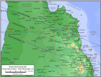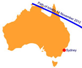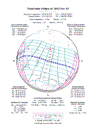 Left – Detailed map shows path of shadow of sun during eclipse across the top Australia November 13, 2012 – Passing just north of Cairns |